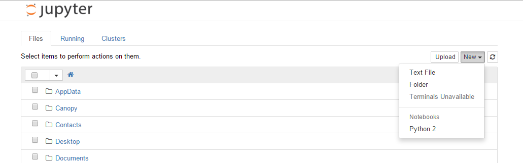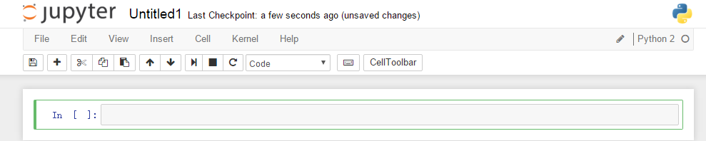 点击右上角的按钮New–>Folder, 新建文件夹用来存储IPython运行结果,新建文件夹默认名字为Untitled Folder。 选中此文件夹左侧的方框,会出现Rename按钮用来重命名此文件夹。 直接点击此文件夹,进入文件夹内部, 此时再点击右上角的New按钮,选择Python2,就会打开Ipython notebook的.ipynb文件的编辑页面,如下图: